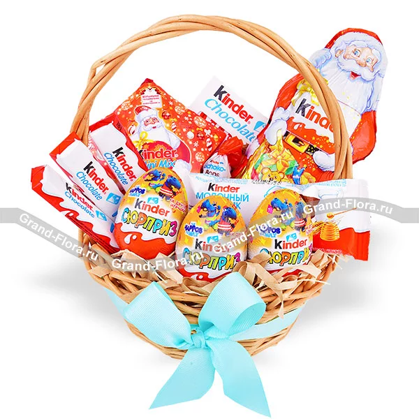 Стандартный: киндер "Дед Мороз", киндер яйцо - 3 шт., киндер бисквит - 1 шт., киндер шоколад - 50 г., киндер "Maxi" - 1 шт., киндер "Звезда" - 1 шт., мини корзина, лента.